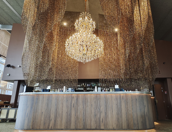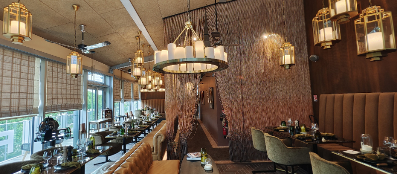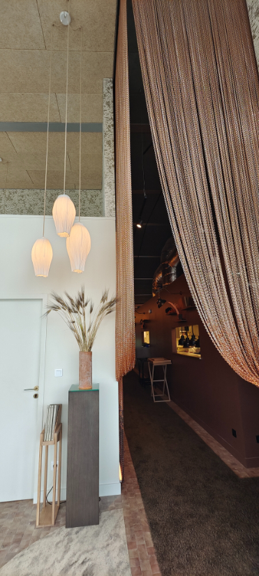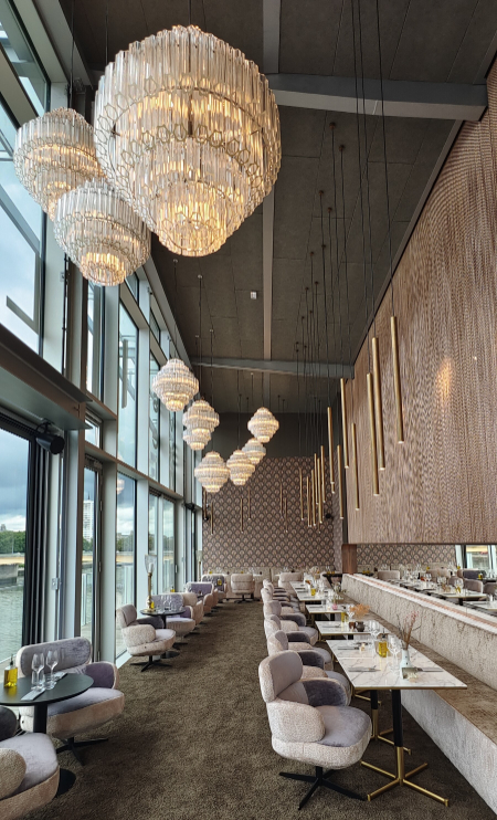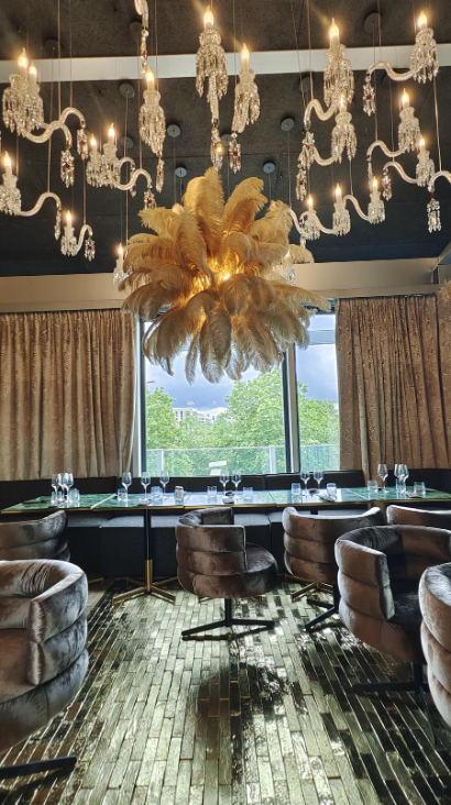Z&V has manufactured custom lighting selected by the Head of Design, including the central bar's "Lustre Mongolfiere" and the "Ostruch Lustre" in the "Cabinet de Curiosité." These lighting elements are not only aesthetically pleasing but also strategically placed to create distinct settings that enhance the overall atmosphere of the restaurant. By carefully balancing brightness and colors, the lighting layout elevates the dining experience while maintaining an inviting environment.