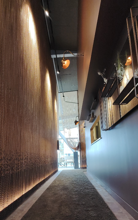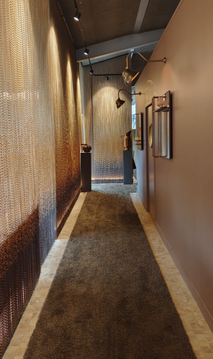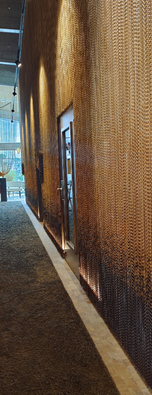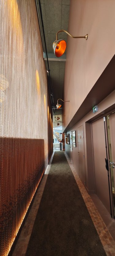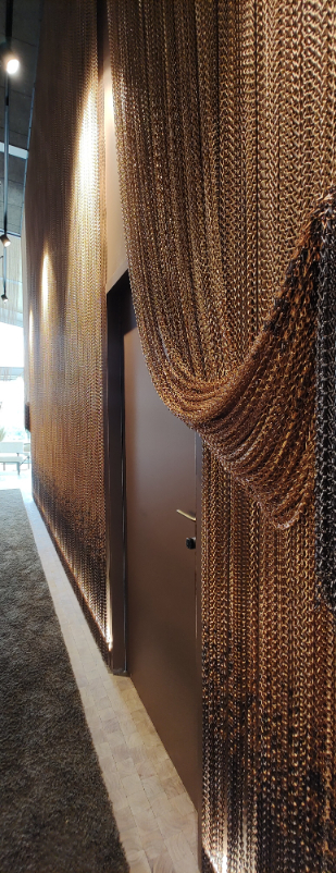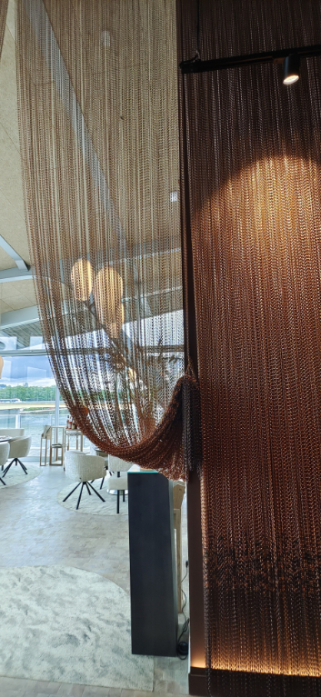 Alongside lighting solutions, Z&V has fabricated and installed 7,000 lines of mesh curtains. These curtains, made up of over 2.5 million aluminum hooks, feature three different colors and a mixed pattern generated by AI, resulting in an organic and natural look. Despite the challenges posed by the IPN bearing structure and the dense activity of hundreds of craftsmen on site, we successfully created this stunning floating structure that adds vibrant colors, textures, and style to the venue.